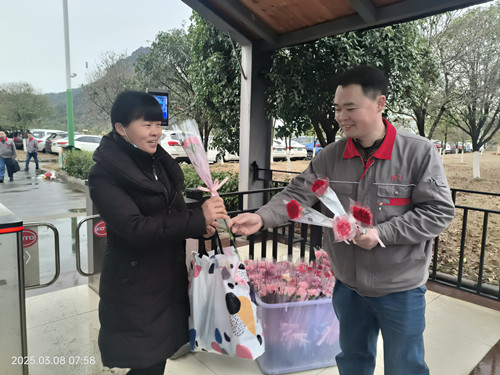 3月8日清晨,公司男領導們早早守候在公司一道門、二道門、南門入口處,為每一位上班的女職工送上嬌艷欲滴的鮮花和節日的祝福。一束束鮮花,一張張笑臉,構成了清晨最美麗的風景線。